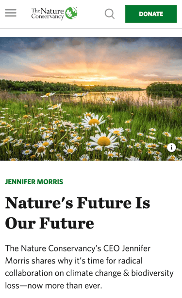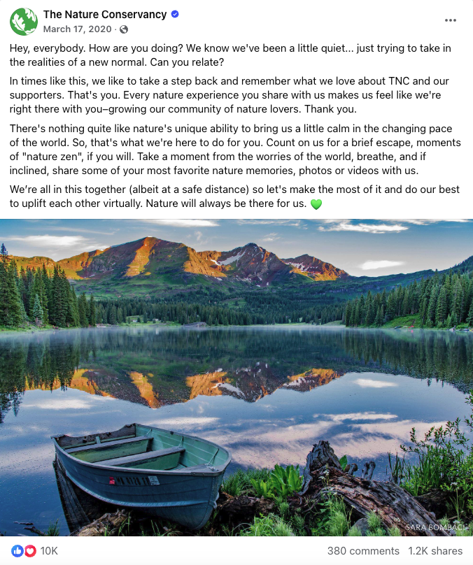 In 2020, The Nature Conservancy's organizational goals shifted due to the challenges of COVID-19. In collaboration with the crisis and response team, I served as a key member strategist in developing a more sensitive social media approach and ensured mindful and measured top-down messaging across social channels and nature.org.
