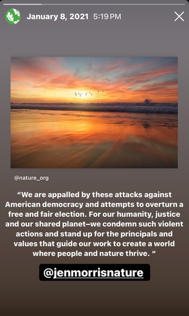 This included leveraging social media listening tools to monitor engagement and conversations across channels. In addition to heavy social and digital monitoring at this time, I managed a remote intern that supported these responsibilities as TNC welcomed new CEO Jennifer Morris amidst BLM protests, the 2020 election and the January 6th insurrection.