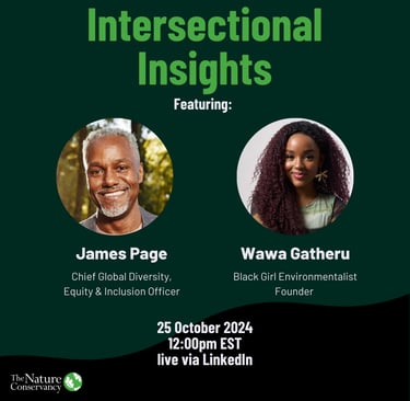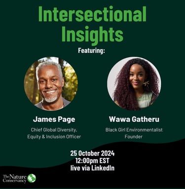 These events have now evolved into Intersectional Insights, a series launched in 2022. I worked closely with the the DEI team to support with production that is hosted by TNC's Chief Global Diversity, Equity, and Inclusion Officer, James Page. These are now quarterly events on LinkedIn.